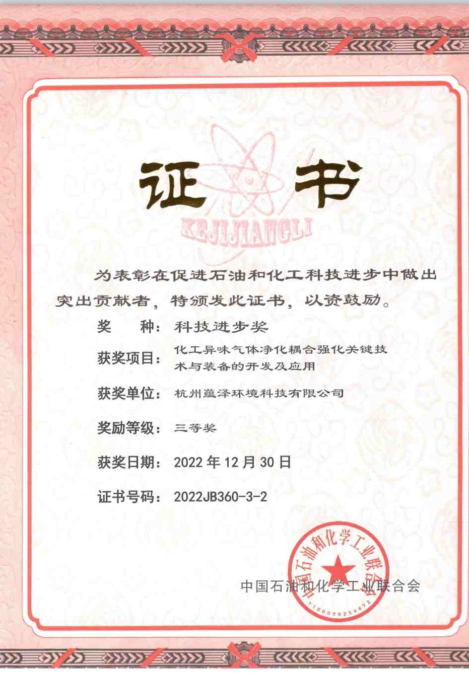 2022年12月30日,根據(jù)《中國石油和化學工業(yè)聯(lián)合會科學技術(shù)獎勵辦法》及《石油和化工行業(yè)專利獎獎勵辦法》的有關規(guī)定,經(jīng)中國石油和化學工業(yè)聯(lián)合會科技獎勵評審委員會終審決定,特別表彰杭州蘊澤環(huán)境科技有限公司在促進石油和化工科技進步中做出的突出貢獻,授予蘊澤環(huán)境科技進步獎三等獎,并頒發(fā)榮譽證書和獎牌。本次獲獎的技術(shù)——“化工異味氣體凈化耦合強化關鍵技術(shù)與裝備的開發(fā)及應用”獲得了中國石油和化學工業(yè)聯(lián)合會專家組的高度評價與認可,是對我司技術(shù)創(chuàng)新、推廣應用工作的鼓勵、支持與信任。